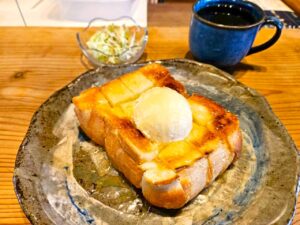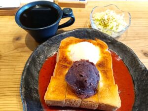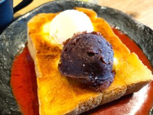 こちらは厚切りトーストの上に、艶やかなつぶあんとアイスクリームがトッピングされたシンプルなスタイル。ですが、一口食べて驚きました。あんこの上品な甘みと、溶け出したアイスのミルキーさが、トーストの香ばしさを最大限に引き立てているんです。