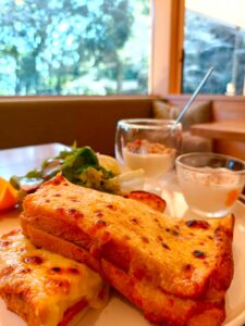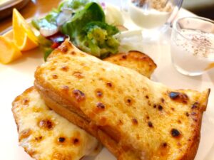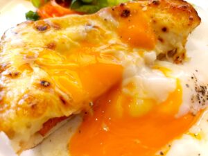 メインのクロックムッシュは、外はカリッと、中はとろけるようなチーズの旨味が凝縮されています。さらに嬉しい演出が、添えられた「温泉卵」。