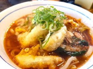 出汁を一口飲むと、ピリッとした刺激が追いかけてきます。この絶妙な辛さが、プリプリのもつと相性抜群!さらに、福岡うどんの相棒「ごぼう天」もトッピングされていて、サクッとした食感が良いアクセントになっています。