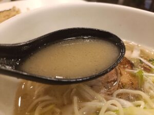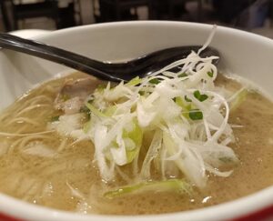 麺は「普通」でお願いしましたが、ツルツルとした食感でスープによく絡みます。そして、意外だったのがトッピングのネギたっぷりのっていて、ほんのり甘みが感じられ、濃厚なスープの良いアクセントになっています。Googleのレビューでも「今まで食べた豚骨で一番好き!」「スープが飲み干せる」と絶賛されているのも納得です。