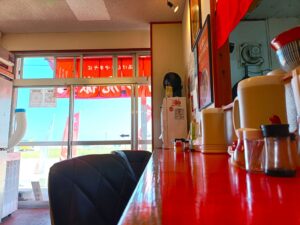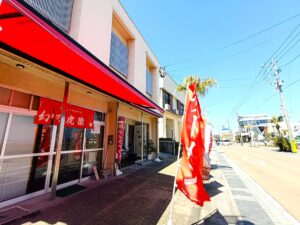 お店に近づくと、パッと目に飛び込んでくる鮮やかな「赤いのぼり旗」。これがあれば、初めての方でも迷うことはありません。