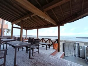 そして、このお店最大の魅力はなんといっても「ロケーション」。お店のすぐ横には雄大な錦江湾(鹿児島湾)が広がっているんです。晴れた日には青い海と空、そして桜島を眺めながらクレープを堪能できるという贅沢さ…。
