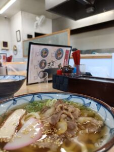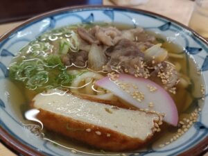 しっかりとした出汁の香りが食欲をそそります。一口スープを飲んでみると、ほんのり甘いと感じる独特の出汁が、体に染み渡るような優しい味わい!Googleの口コミでも「ほんのり甘い独特な出汁が大好き」という声がありましたが、まさにその通り。お肉とうどん、そしてこの出汁が三位一体となり、あっという間に完食してしまいました!