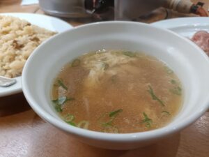 主役だけでなく、脇役の鶏スープもこれまた絶品でした!口コミで「スープが中でも別格にうまい」とあった通り、鶏の出汁がしっかり効いていて、深みのある優しい味わい。鶏めしと一緒に飲むと、さらに美味しさが引き立ちます。